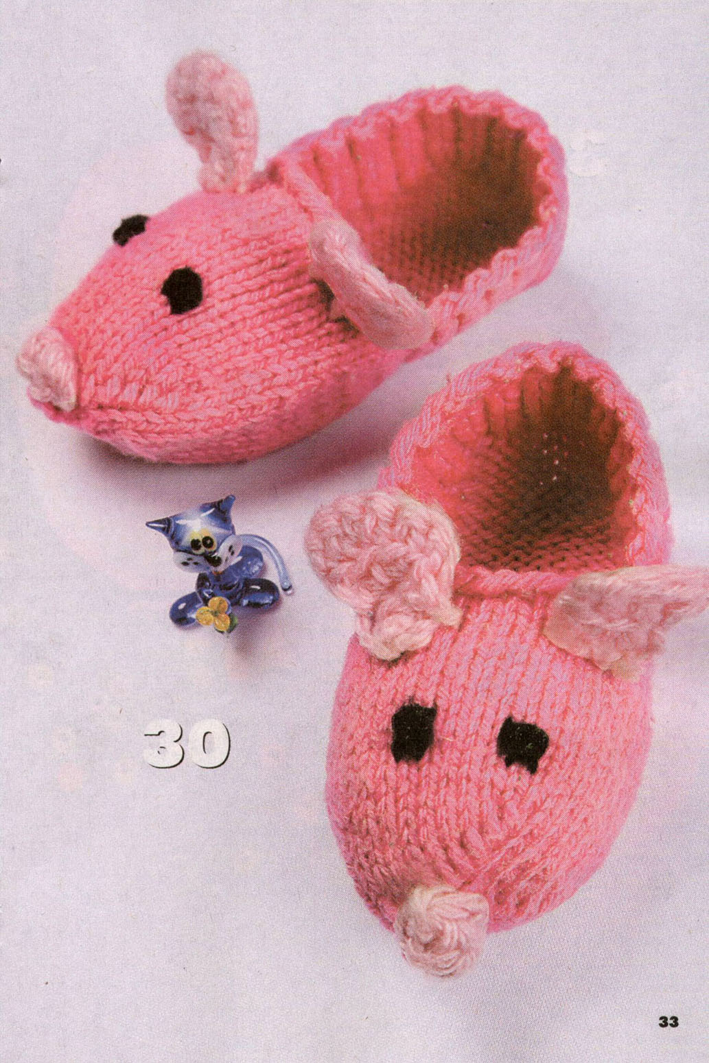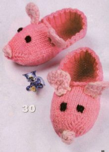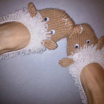Coming into the store of goods for home and comfort, you can stumble upon a model of knitted slippers-toys, which will cost no more than 280 rubles. These slippers are offered for both children and adults. These are cute low slippers with a knitted elastic strap fixing it on the leg and a kitten's muzzle.