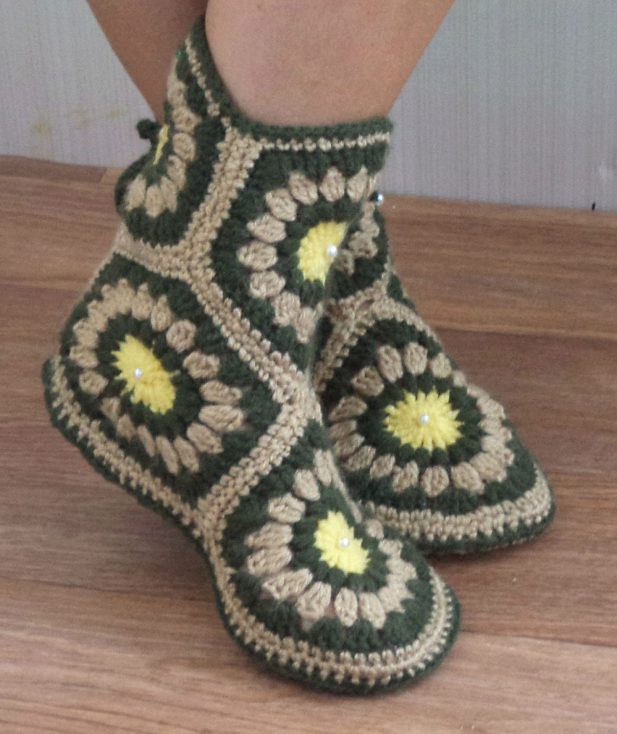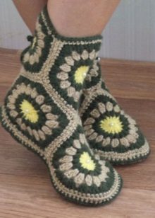 A striking example of a motif model crocheted slippers. They are quite elegant, conservative and homely. The sole is made of half-woolen yarn in two threads. This, of course, is not the most durable option, but such a seal will significantly increase the service life.