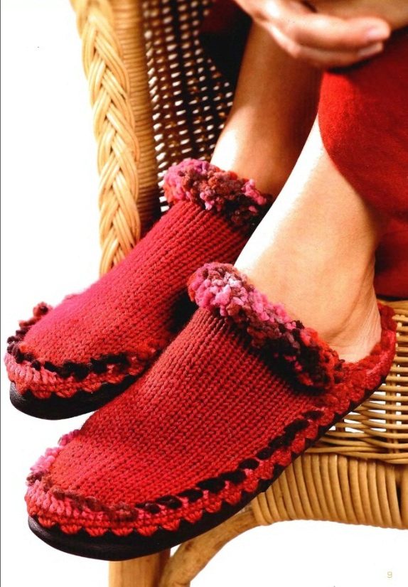 - on the sole. The main disadvantage of knitted slippers is the quick wear of wool soles. However, this can be avoided by making home shoes immediately based on a felt or rubberized sole.