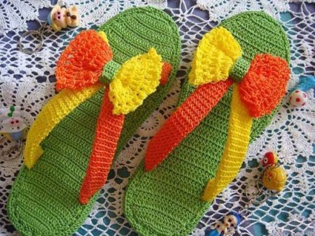 Top 10 of the most beautiful and incredible knitted slippers reveal bright flip flops with large bows. The sole of this original model consists of a polyurethane insole tied with yarn. They are made in the form of beach slippers.