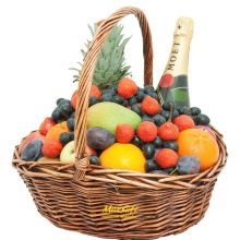 - Fruit basket. There you can put not only fruit, but also sweets. Harmoniously add to this uncomplicated but pleasant gift a bouquet of flowers.