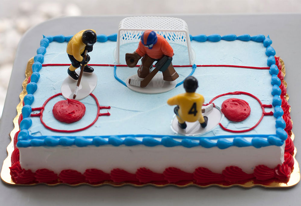 Cake decorated in the form of a hockey field, stick or puck will be an excellent and original gift.