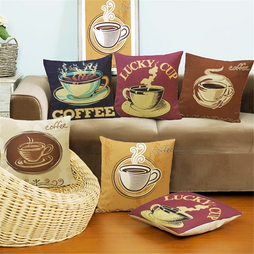 - cushions with a picture of a coffee tree, a cup with a drink or letters of the word;