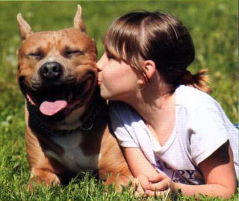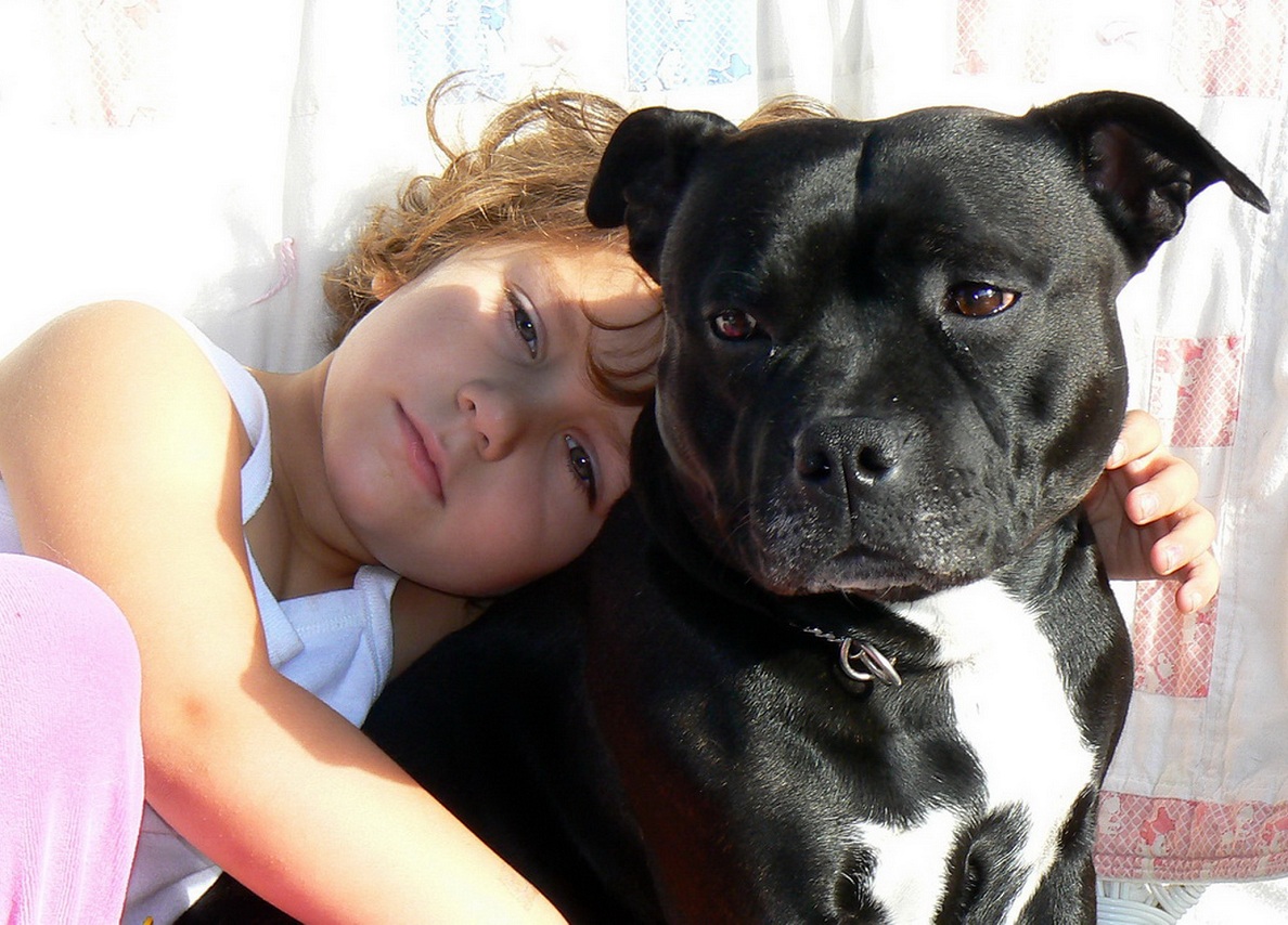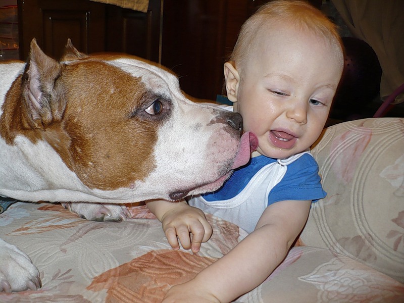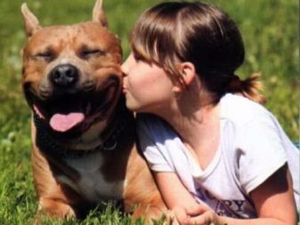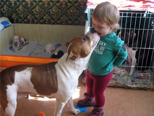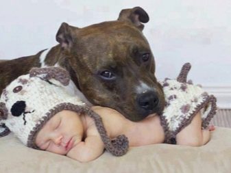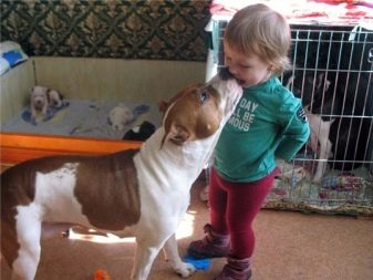 In communicating with small children, amstaffs (especially bitches) act as real nannies who will not only support all their pranks, but will also protect children from other animals, protect their sleep and safety. Such an attitude towards children is possible only with proper upbringing. With improper upbringing it can happen that the child will play with the pet and will not notice when the game goes beyond the scope of entertainment and turns into a serious fight.