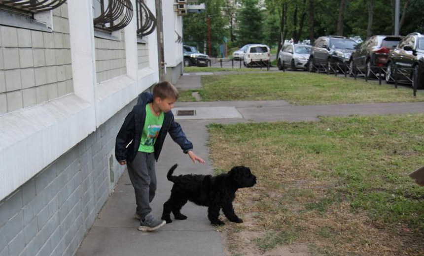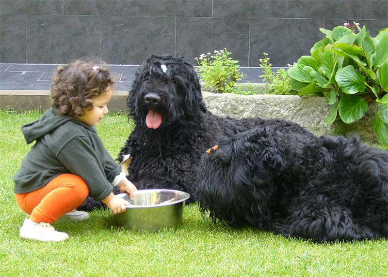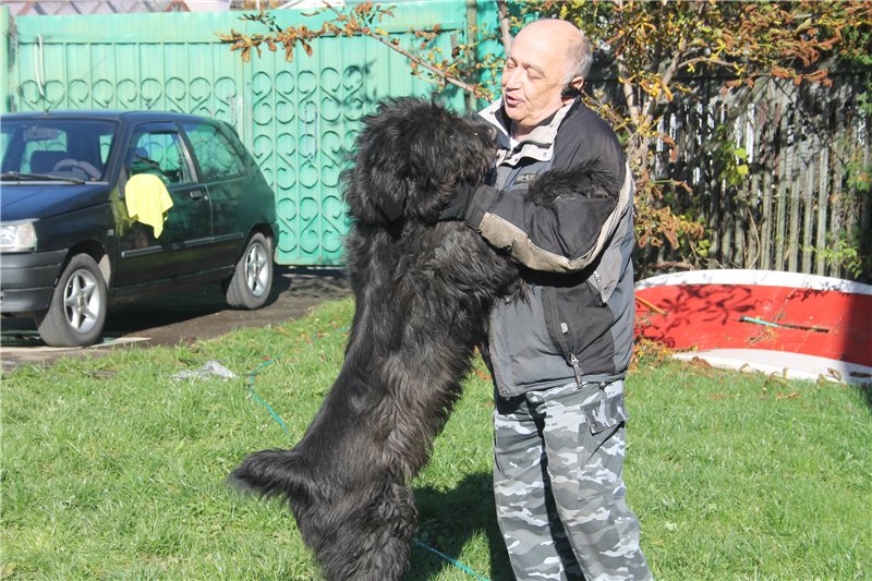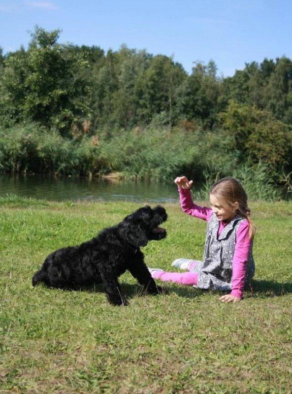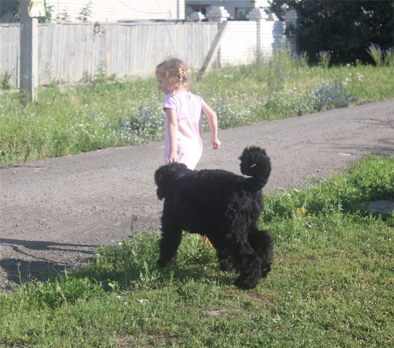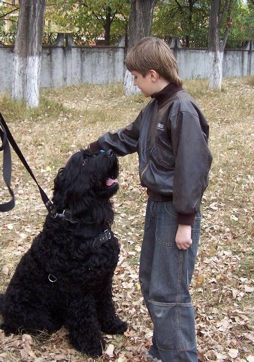 A prerequisite for the normal development and exploitation of the black terrier is early socialization. If it is not produced, there will later be a series of problems in communicating with other animals and with people. Terriers in general tend to unwarranted stubbornness. A rational approach and daily classes in a special program help to circumvent this feature or to significantly weaken it. With all the severity of its appearance, the BRT is excellent with children and is able to tolerate calmly all their leprosy.