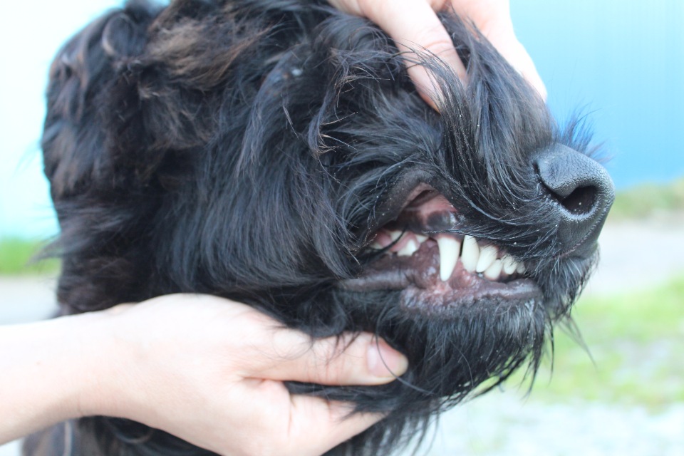 The gums of a black terrier are dark in color. The neck is long. Although the ears are hanging, they are raised rather high. Typical for them is a triangular configuration. Dry eyelids rigidly fitted to the surface of the eyes. The eyes themselves are oval.