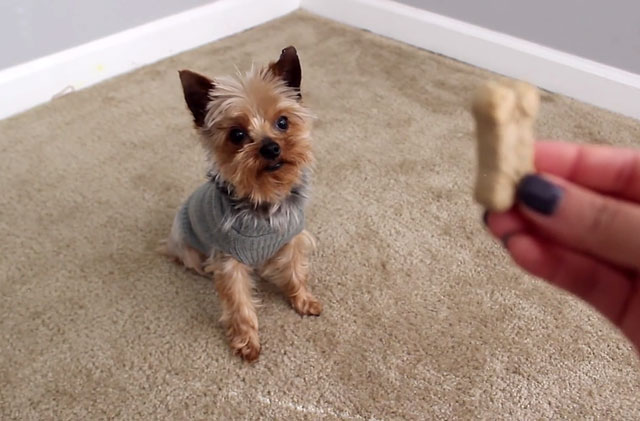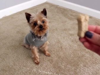 - "Lie down". First show the dog a treat, then lower the hand and lead it forward. When york tries to take it out of hand, give this command and, having waited for its fulfillment, hand the dog a reward.