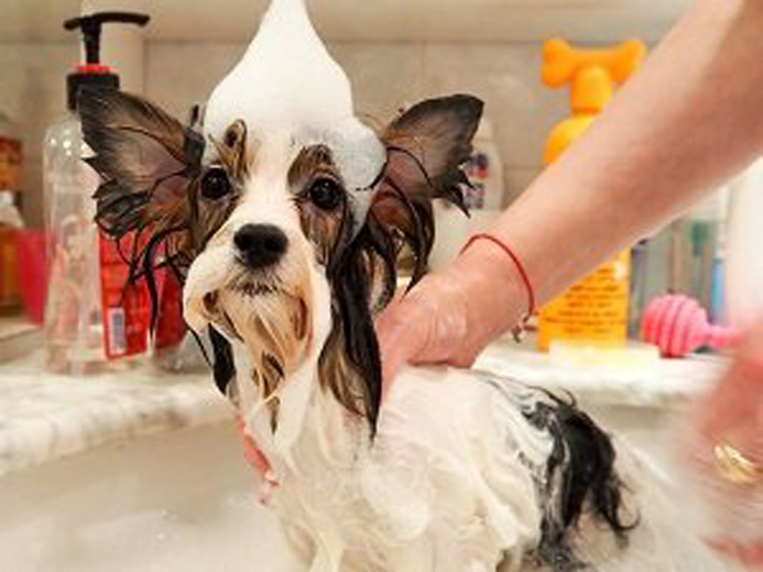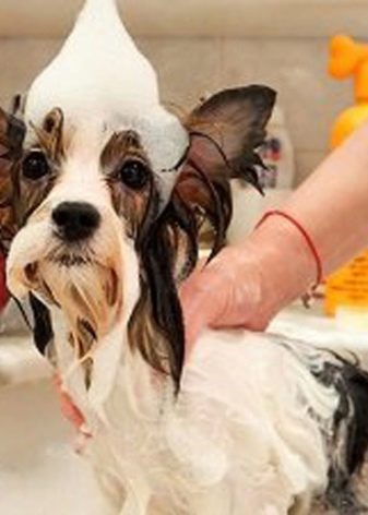 - Bathing should be carried out 1-2 times a month. Pet close the ears and wash the body with a special hypoallergenic shampoo for dogs. To make the procedure more pleasant, you can throw toys into the bathroom. After bathing, the moisture from the wool is removed with a towel and, if necessary, allowed to dry the dog with a hairdryer. Then it is combed.