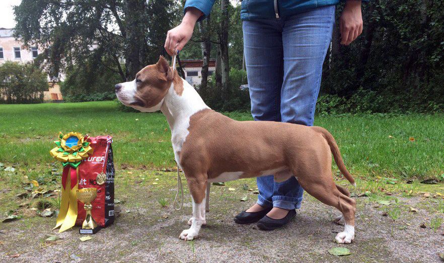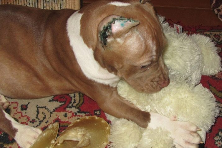 Sometimes crooked ears of a staff terrier puppy do not rise. Then they can be made standing in the form of a “rocking”. Sinks raise through pencils, patches and even curlers. Consult this issue with a specialist.