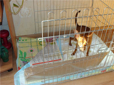 The diaper is laid tightly to the dog bed. After eating, drinking water or sleeping, the puppy is carefully transferred there. In a few days you will not need to move your pet, he will independently resort to relieve himself of the need in the space reserved for this. Some owners are building indoors. small aviaries. The area of the floor covering within it is completely covered with similar materials.