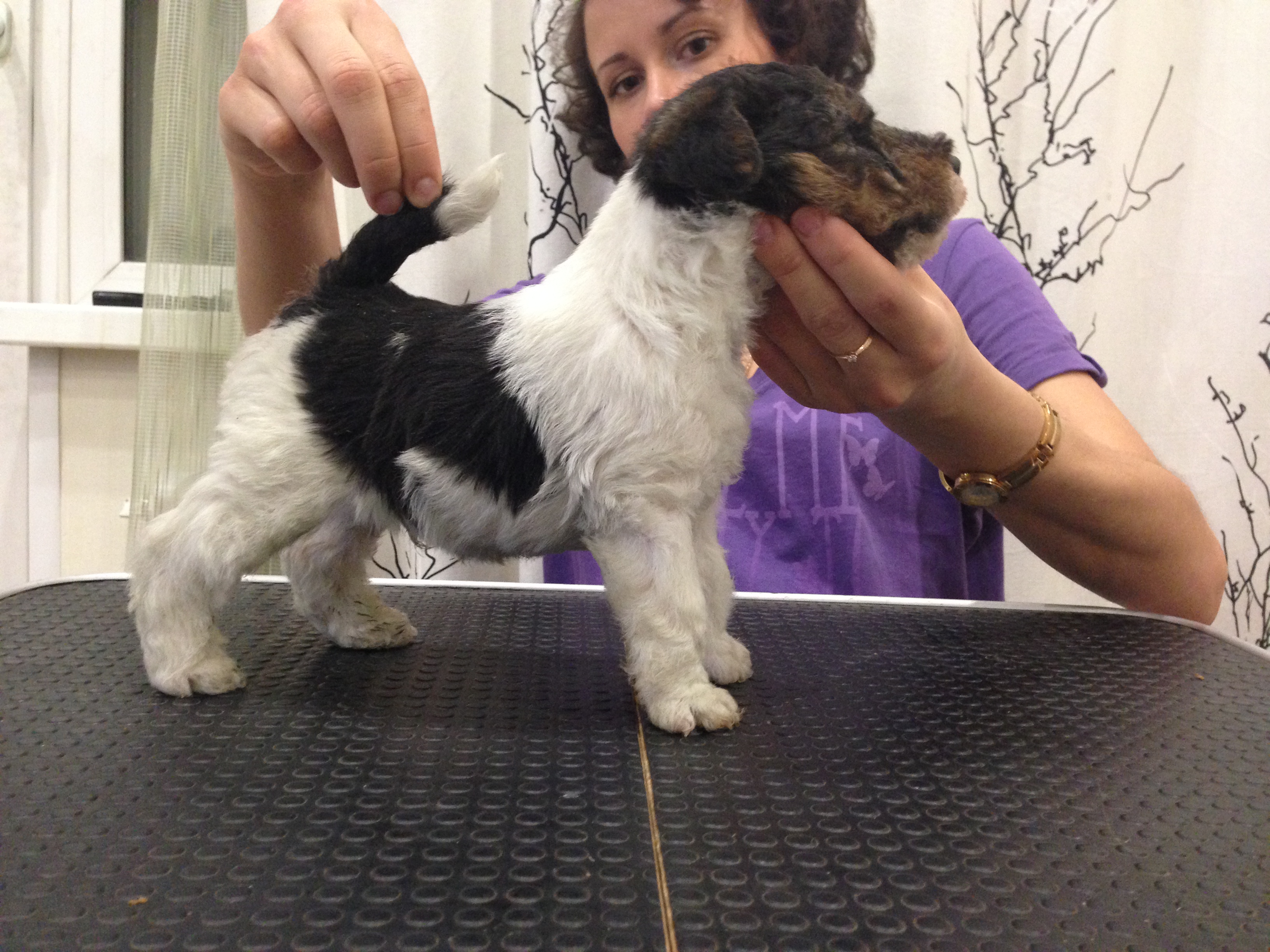 Additional advantages of the procedure are protection of the fox terrier from minor injuries, bites, repulsion of dirt and water due to the quality of wool.
