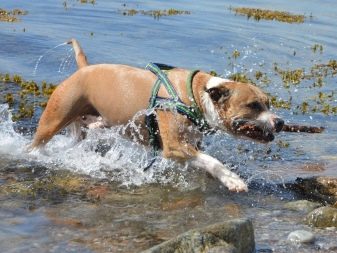 For an adult dog, special exercises are useful to maintain its physical shape, coordination and agility. With proper loads, amstaff will not have the desire to spoil furnishings or to tow the owner from excess forces. Among the most useful exercise options are swimming, towing and running uphill on an inclined plane.