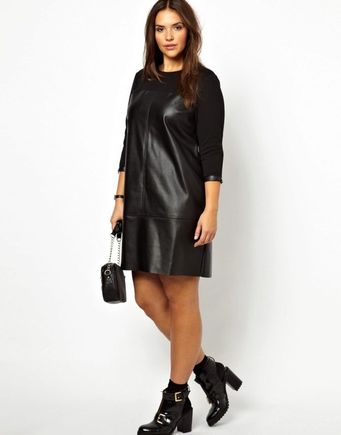 Those who lack the courage to dress in a leather dress can be advised to pay attention to models with leather inserts. The dress can be made of almost any material, as long as it blends well with a rough leather texture. Various details of the dress can be made of leather: sleeves, patch pockets, belt, skirt and other elements. Fat girls are suitable models with side panels, contrasting in color - they visually make the shape slimmer.