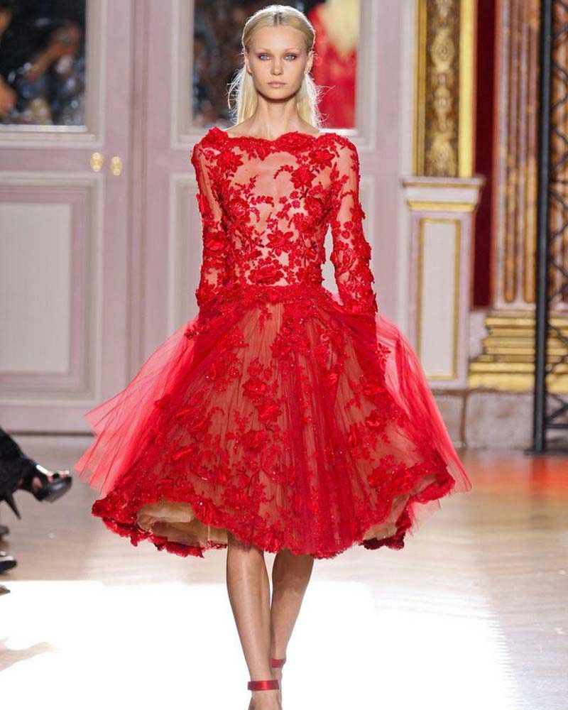 In a red dress you will not remain in the shadows, and will always attract the eyes of others. It is incredibly luxurious, thanks to the stunning combination of color and lace texture. Fine make inserts of contrasting material (leather, knitwear).