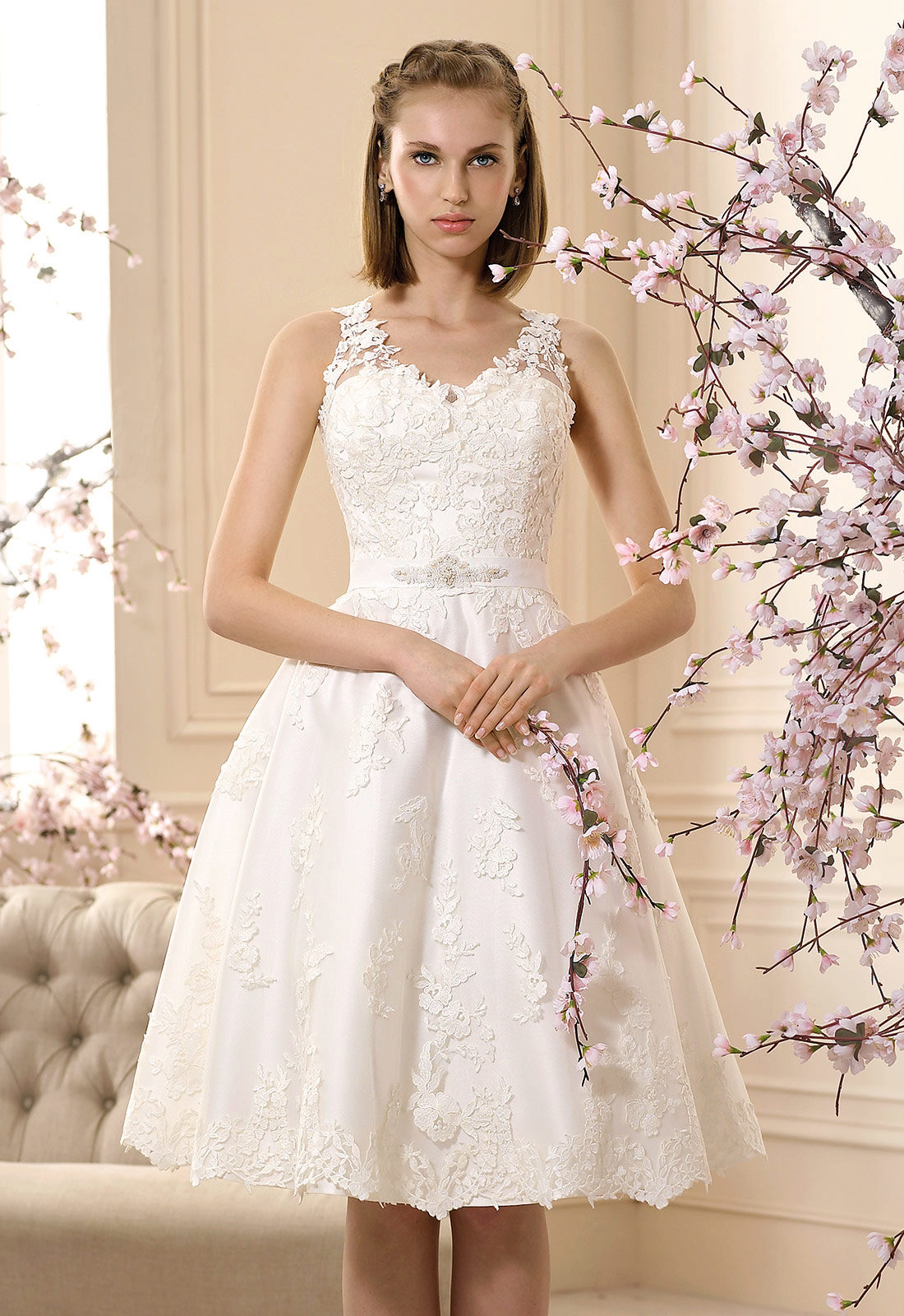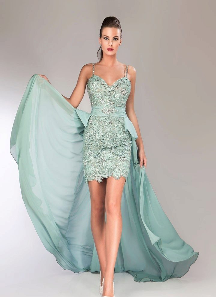 Short models also have a train and are modeled in several versions. The train can serve as a false skirt, detach oneself or be one with the dress.