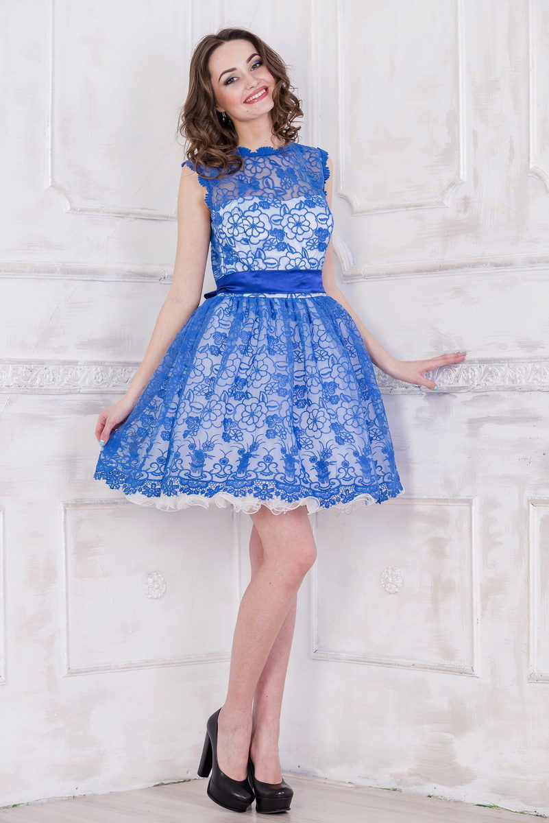 A dress just above the knees without sleeves with lace inserts on the shoulders and a wide lace stripe along the bottom of the skirt is a great option for young ladies. The satin belt in tone of the dress will be its peculiar decoration.