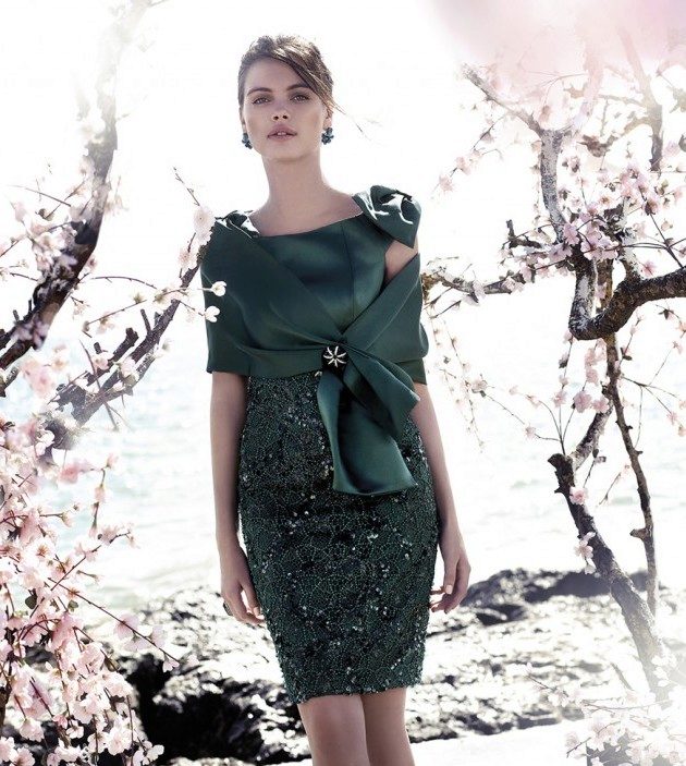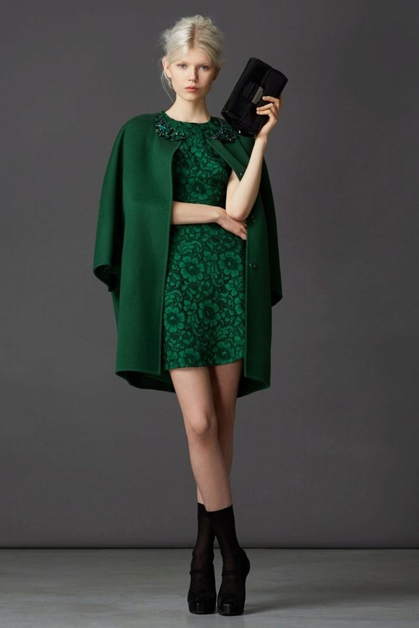 An emerald dress of medium length lace will be a wonderful everyday, if you complement it with a bright blue cropped jacket and similar ankle boots.
