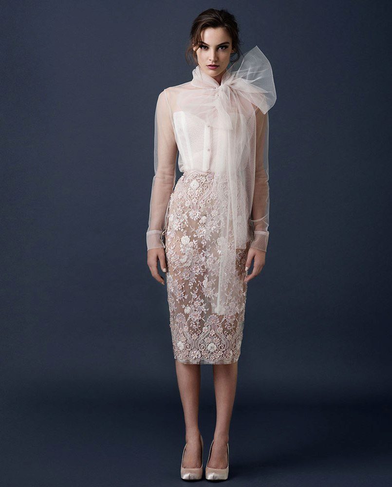 Stitched tiers or frills of organza on straight silhouettes add a piquancy to the image, originality. So the image will be, if you choose a model with a top of soft organza and a bottom of lace.