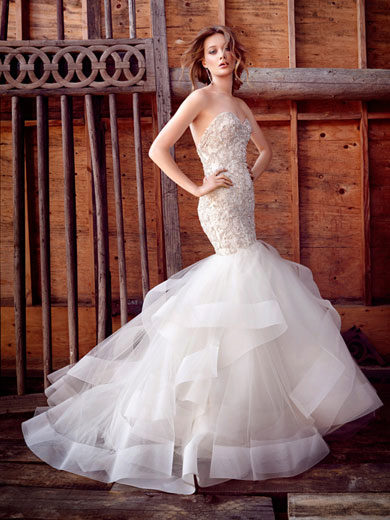 Among the modern brides are gaining popularity dresses from organza. Since this material is characterized by its ability to keep its shape well, the designers form from it complex folds and fantastic draperies on lush models and mermaids. Due to such decisions, dresses made of organza are original and voluminous.