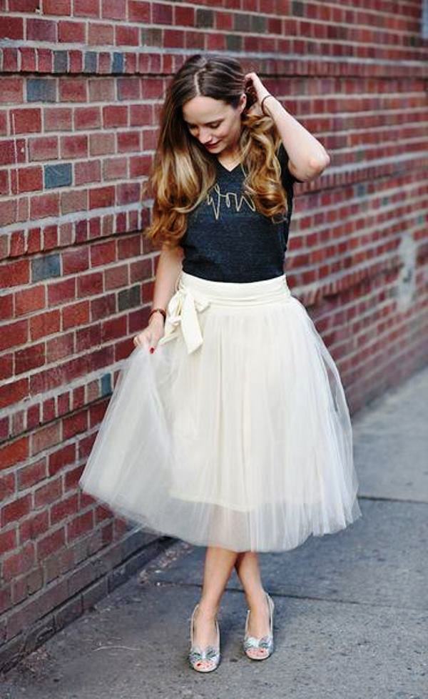 On the streets you can meet girls who combine puffy skirts of organza with T-shirts and tight T-shirts. This option is suitable for persons with long and slender legs. The presence of a wide waist serves as a reason for refusing such a dress.
