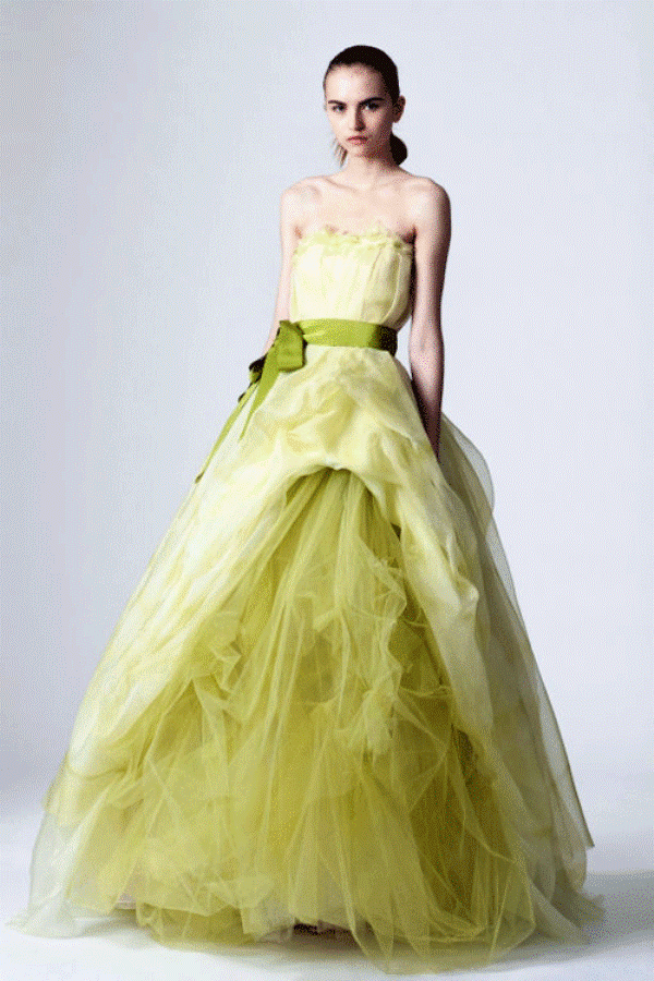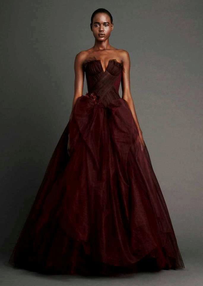 A red organza dress looks bright but not defiant. This is proved by wedding dresses from Vera Wang in pink, scarlet and burgundy colors.