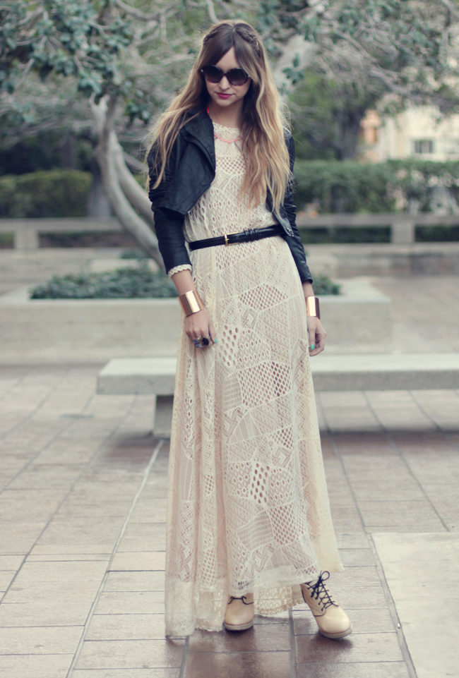 Guipure dress is combined with any outerwear. The combination of light openwork dress and leather jacket looks stylish. Coarse fabric only emphasizes the tenderness of the dress. Wear high boots or heavy boots to complete the look.
