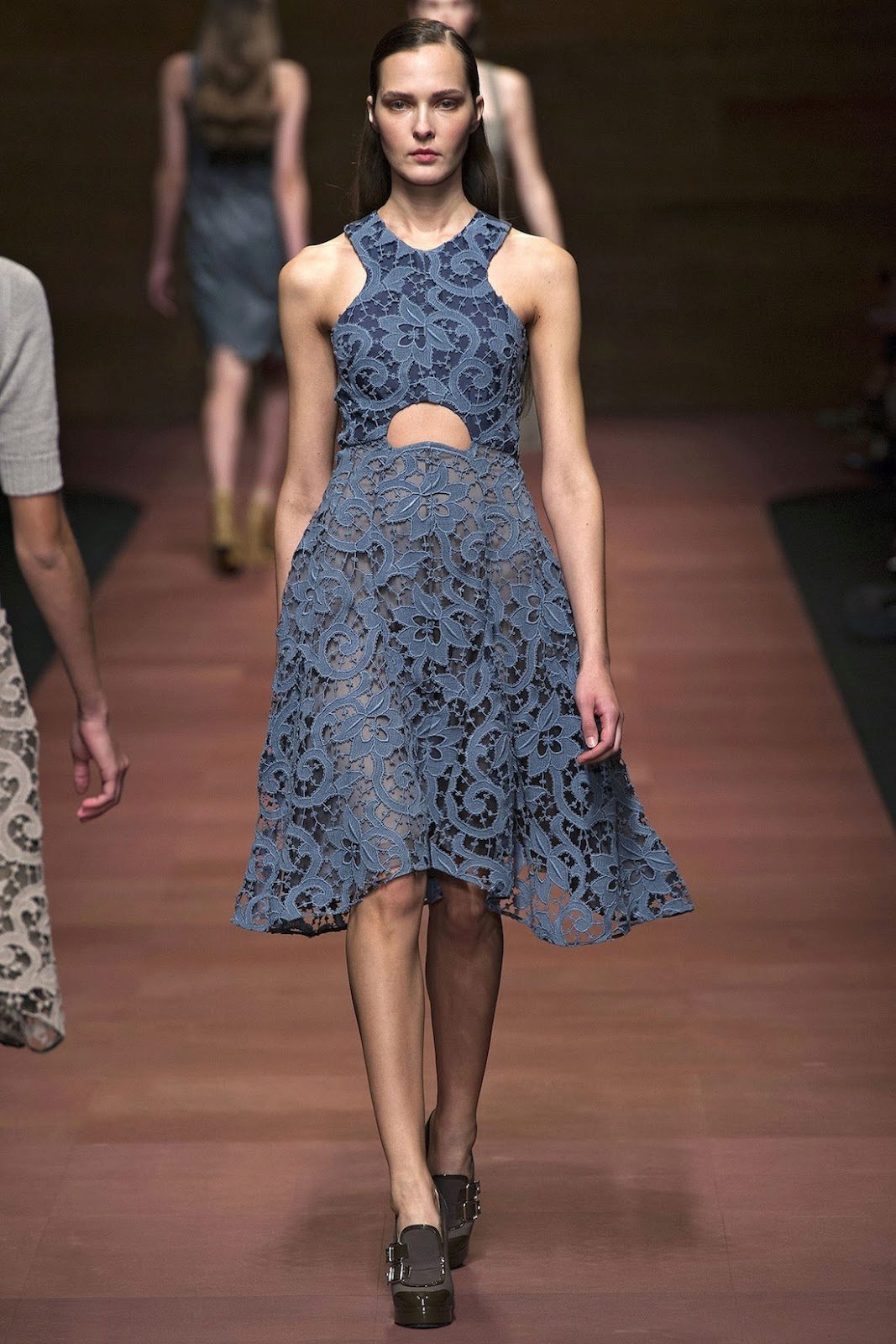 In guipure dresses there are various forms of a cutout on the chest. The most popular ones are: