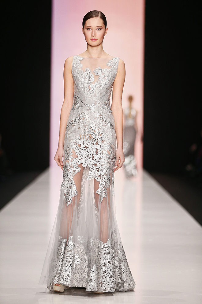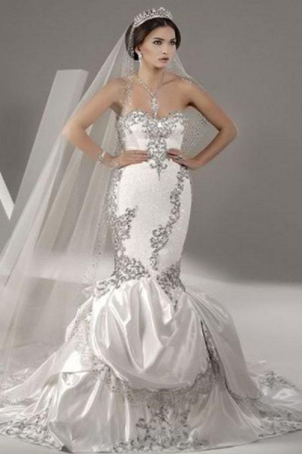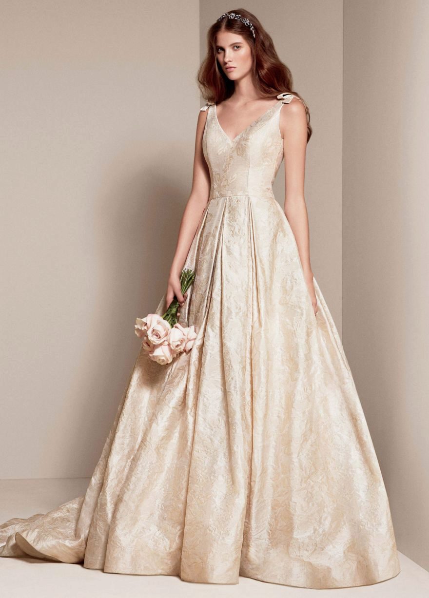 Girls who feel like real princesses often choose brocade dresses for a wedding ceremony - it’s not for nothing that royal personages chose to marry in such a dress. This choice is quite justified: on a snow-white background, gold and silver threads look incredibly beautiful and luxurious.