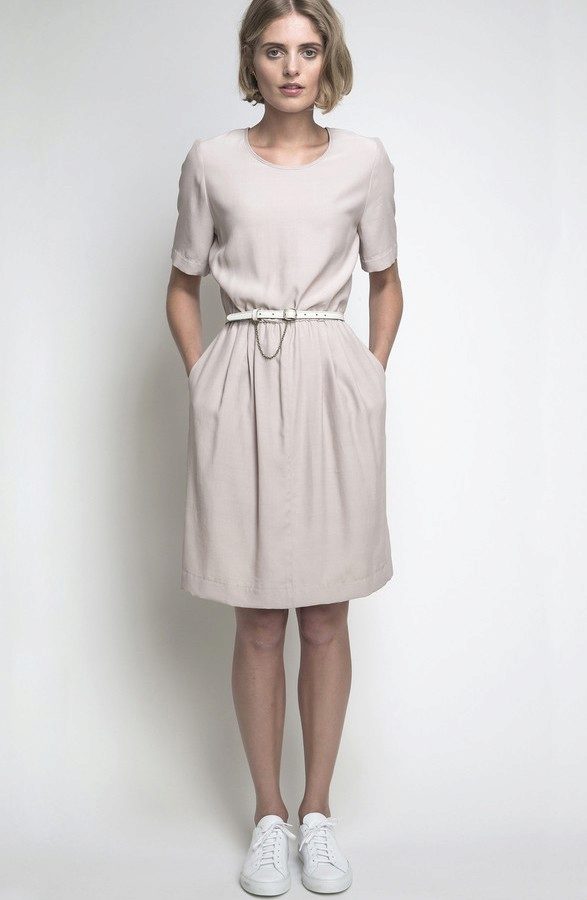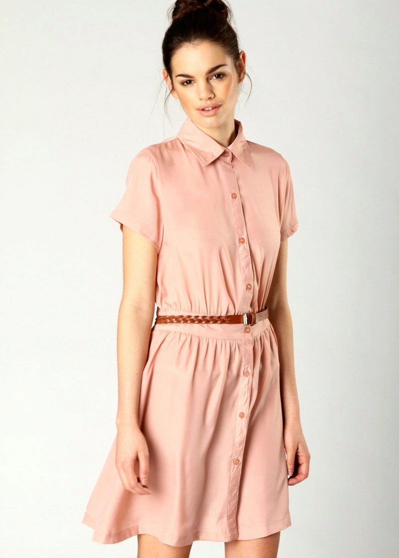 - Shirt dress with a straight silhouette and a detachable collar. The sleeve of such a dress is of different lengths. Such a viscose dress can be worn on your own or worn with leggings of a contrasting color.