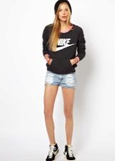 To create an elegant look, you just need to wear shoes with heels. Since the sweatshirt more to the sporty style, then the shoes should be appropriate. It is necessary to give preference to shoes with a steady heel or sandals on the platform.