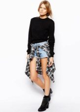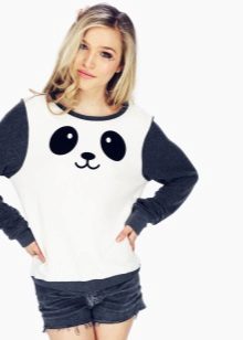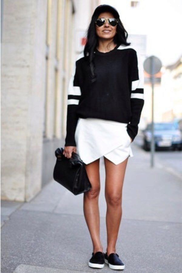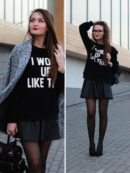 You can create a completely monochrome image. A black sweatshirt with a white inscription looks great with a skirt in a black sun color, as well as black tights and slippers on a stiletto to match the sweatshirt. A small backpack on the shoulder will help to add an image of style.
