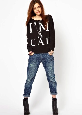 Black hoodies with big white lettering look very nice. These models are ideal pants or jeans in white or blue. There are models decorated with colored drawings or floral ornaments. Such hoodies allow you to pick up things to match the pattern, which significantly expands the color possibilities.
