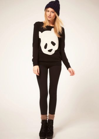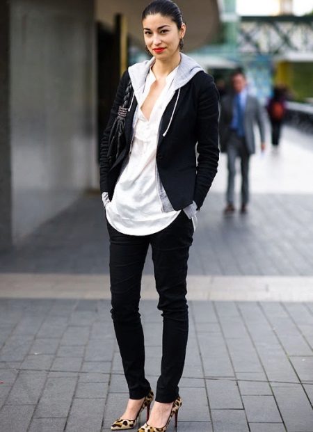 To create a feminine look, an excellent ensemble is a black sweatshirt with a gray inside out and a hood over a snow-white blouse with skin-tight black jeans and leopard-heeled shoes. A small black handbag will be the final element of a beautiful bow.