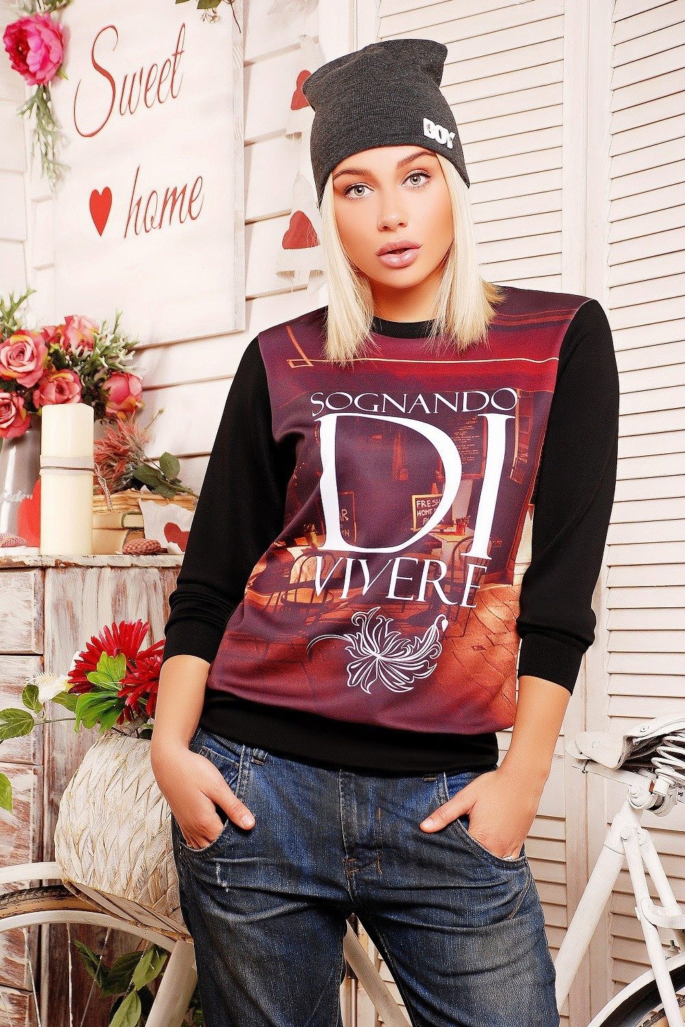 With a black sweatshirt you can create unforgettable youth images, while experimenting with shoes and bottom. The most stylish solution would be a black sweatshirt with skinny jeans of any color.