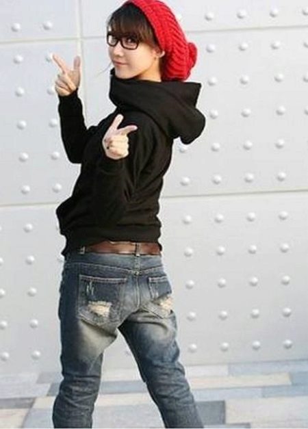 Black sweatshirt with a hood is both a universal and individual thing. It does not accent the image, but emphasizes other elements of the bow. For example, on the background of a black sweatshirt, ripped jeans, a beautiful skirt or bright leggings look more effective.
