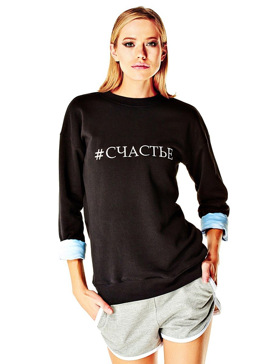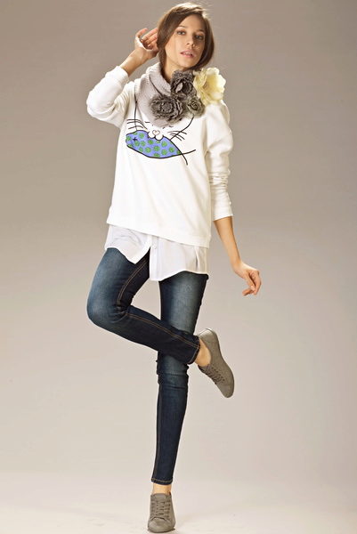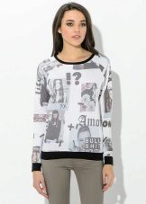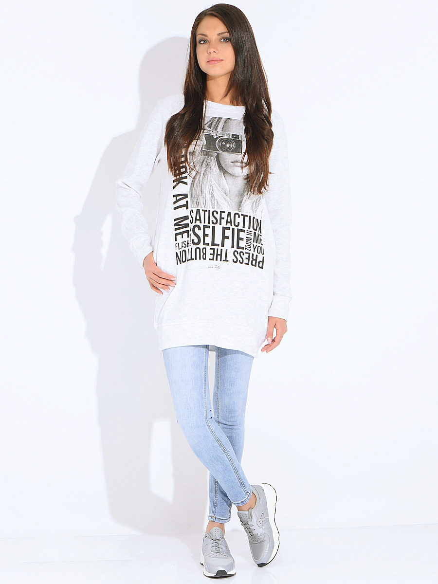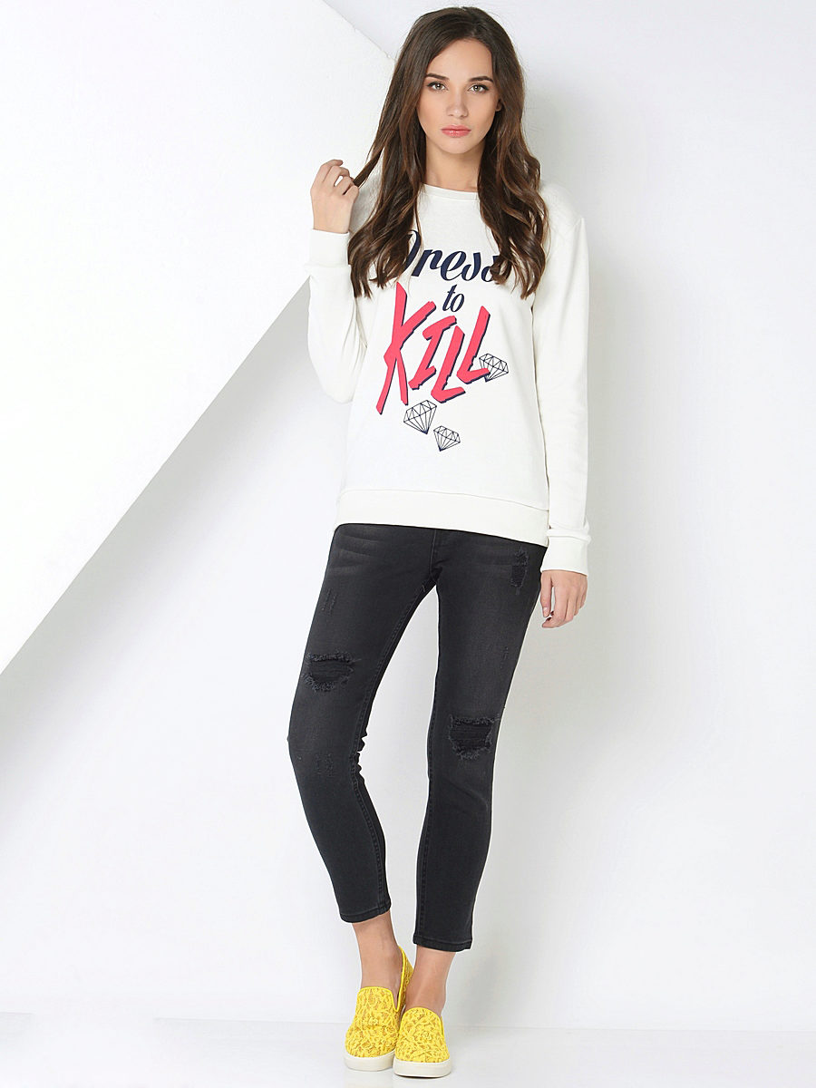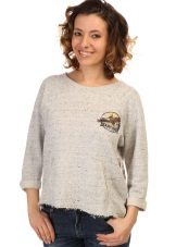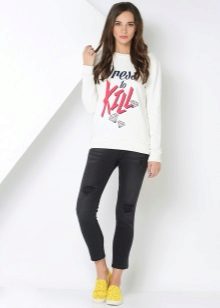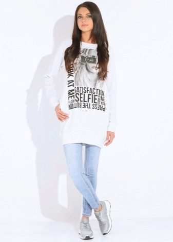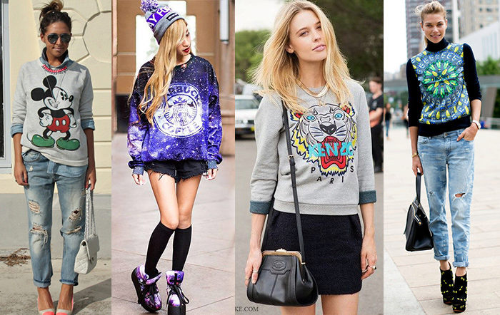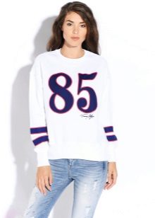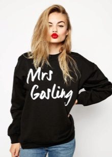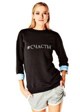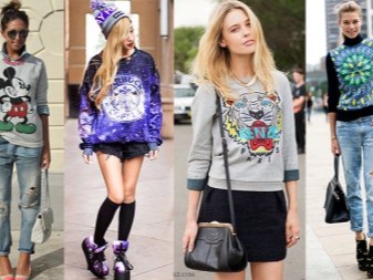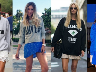 For meetings with friends, going to the cinema, walks, sweatshirts with various funny inscriptions, drawings and prints will fit in perfectly. They are combined with jeans, skirts, tight pants.