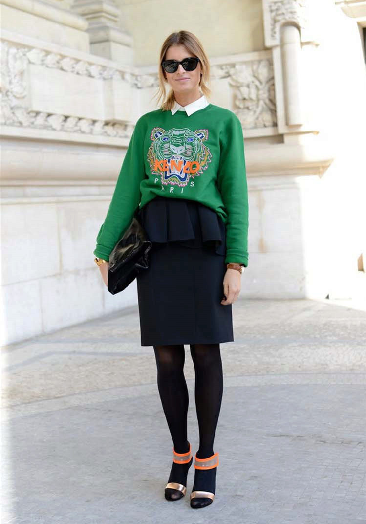 If there is no hard dress code, then it is appropriate to appear at work in a neutral-color sweatshirt. The sweatshirt goes well with a pencil skirt and tight pants. The image is completed with high-heeled shoes and a minimum of jewelry.