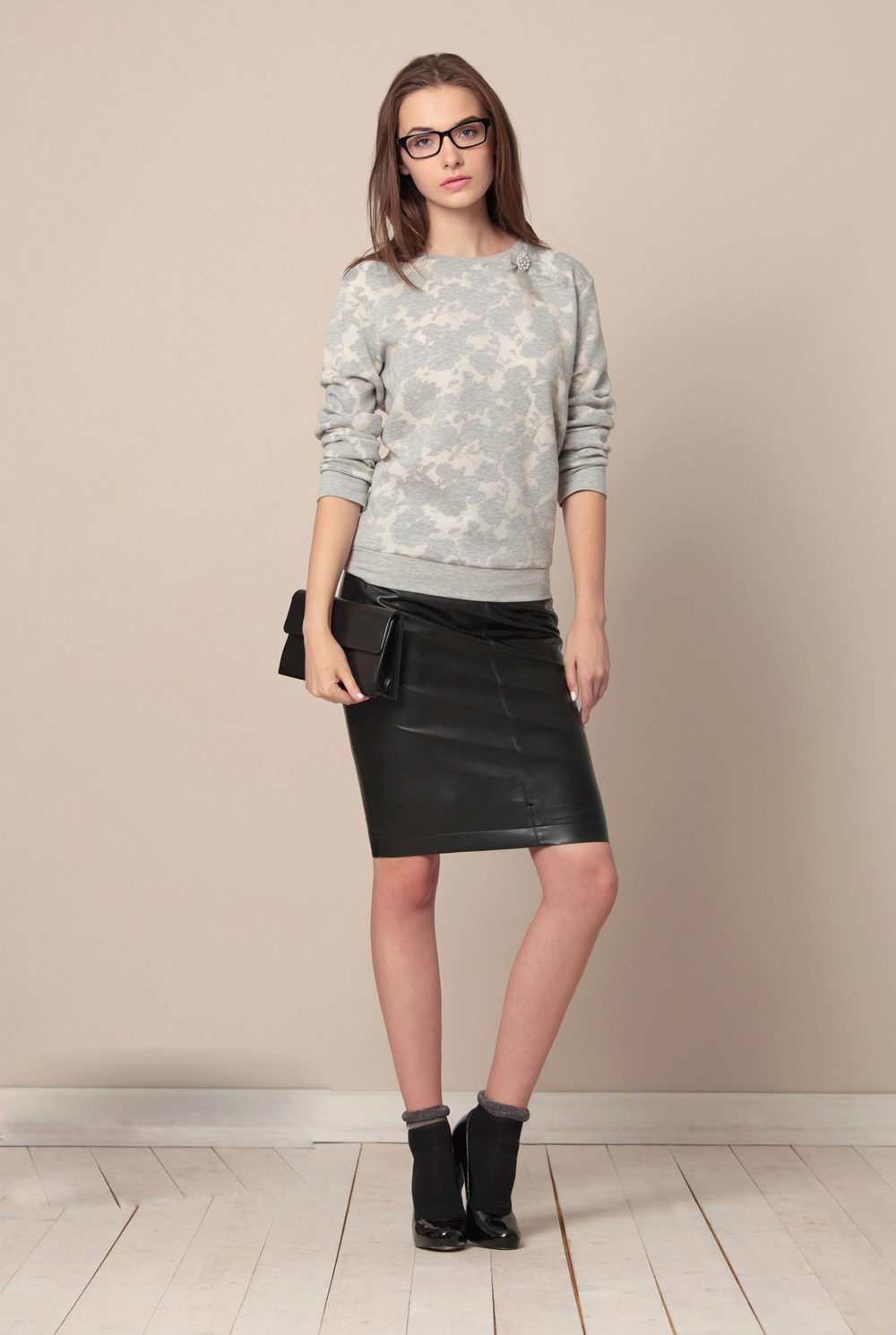 Office bow for working days. Neutral gray sweatshirt with prints and patterns is combined with a pencil skirt, which adds severity. The finished image will be made by shoes - classic pumps or on a massive heel, jewelry and a bag-briefcase.