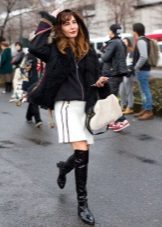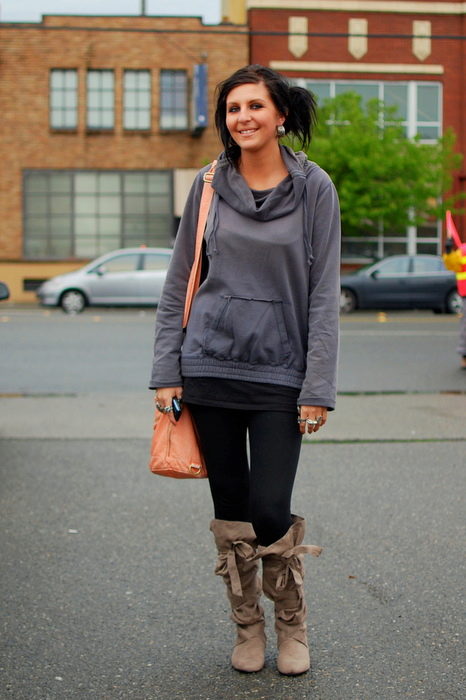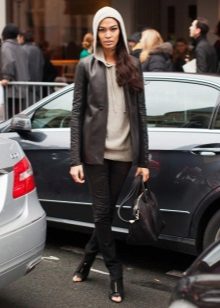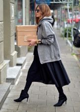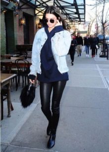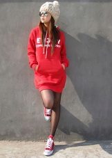 - Leggings, thick tights, knitted stockings above the knees are perfect for long hoodies, hoodies.