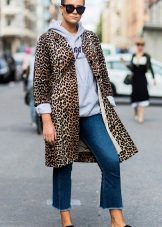 - Slim dark jeans look good with a gray hoodie with a bright and crisp print in the shape of an irbis face that occupies the entire front surface of a hoodie.