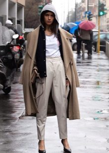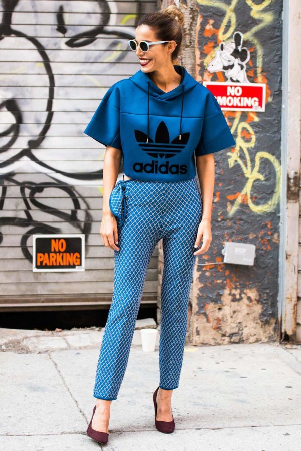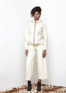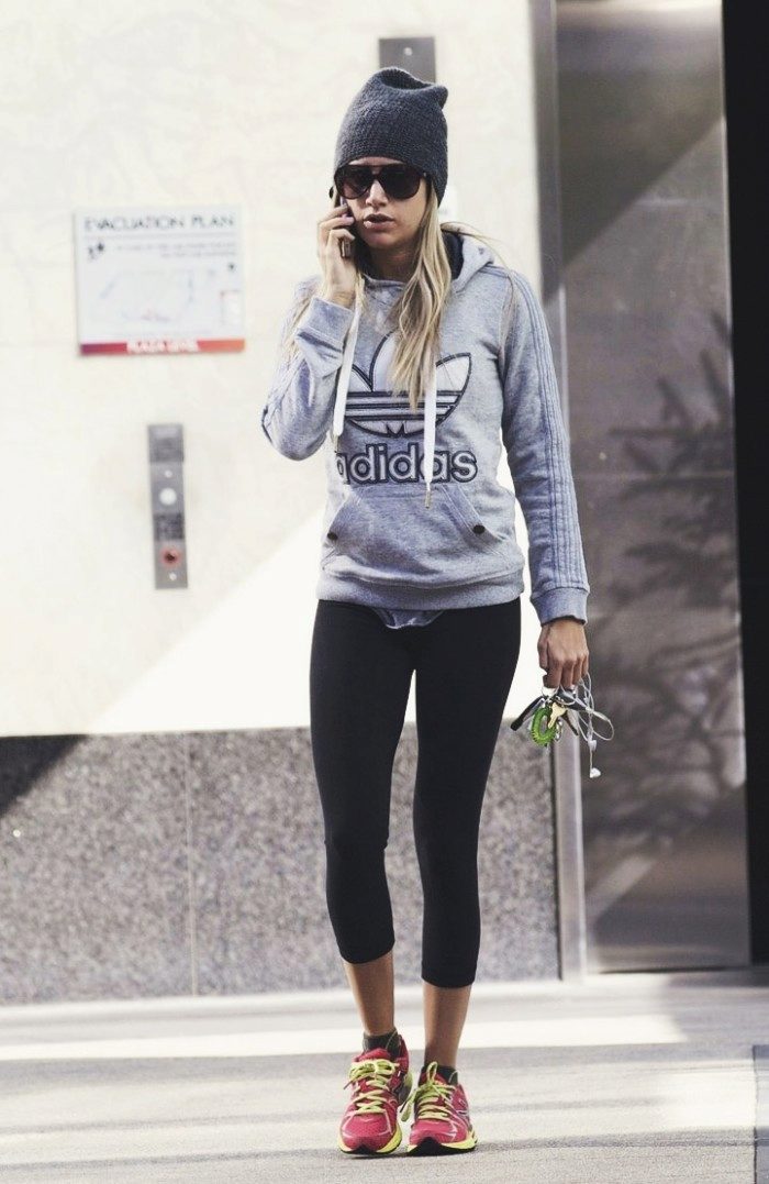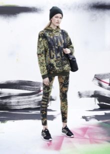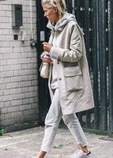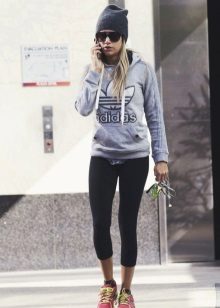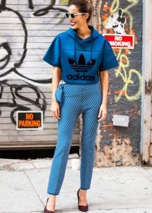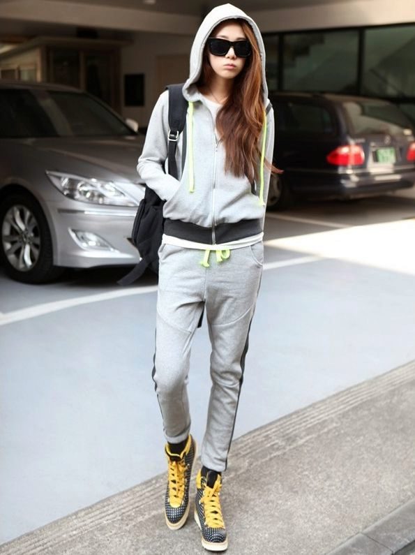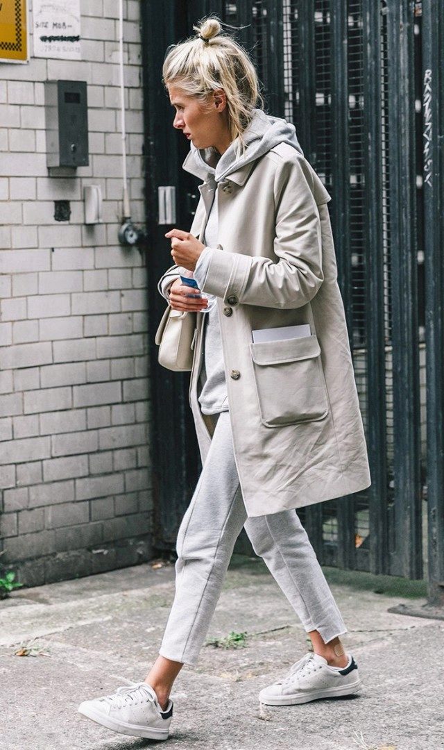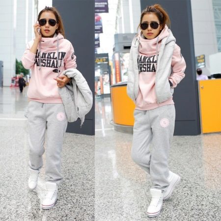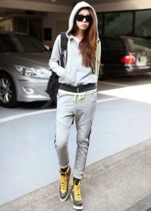 - Hoodie in a delicate neutral color in combination with sports pants of identical color looks advantageous if you put on a sports vest a tone lighter or of a contrasting color. Sports shoes - sneakers, sneakers, or sneakers.