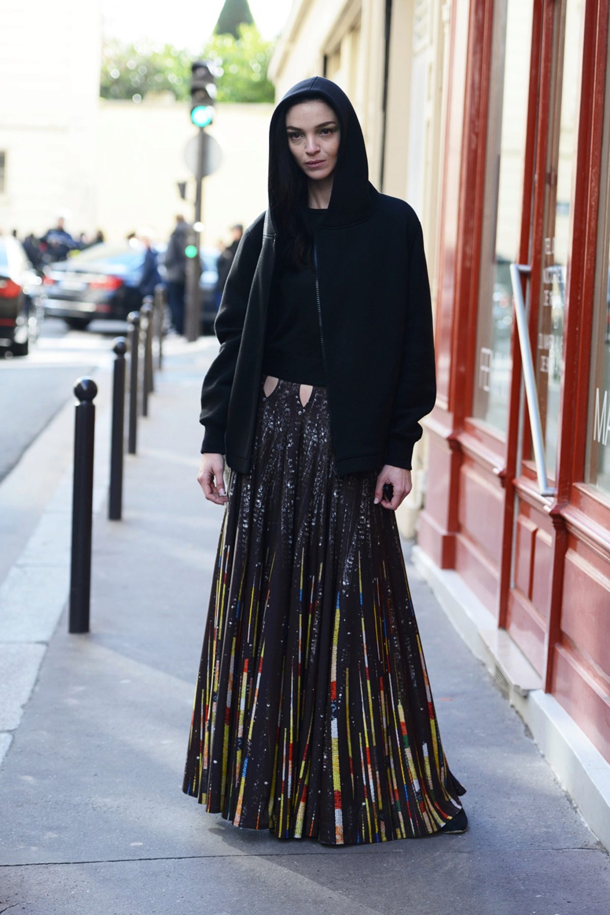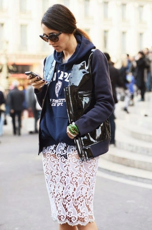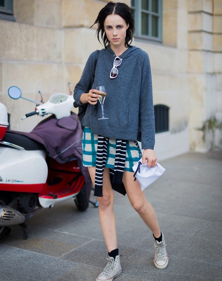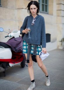 - A short hoodie up to the waist perfectly complements the skirt of a sports tennis style or a short fluffy skirt in a cage, or with pleats. Sneakers and platform sneakers are best for your feet in this way.