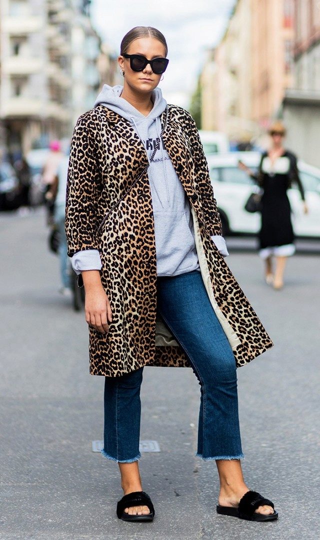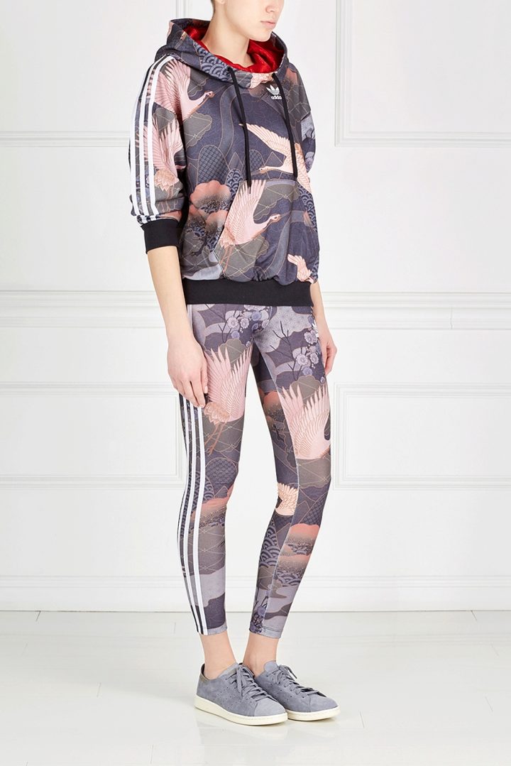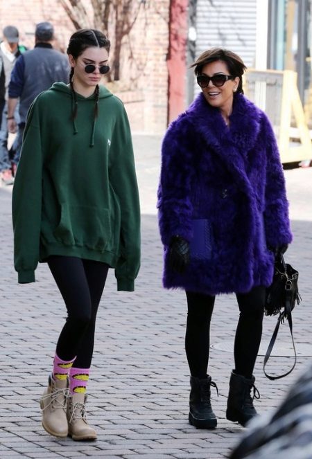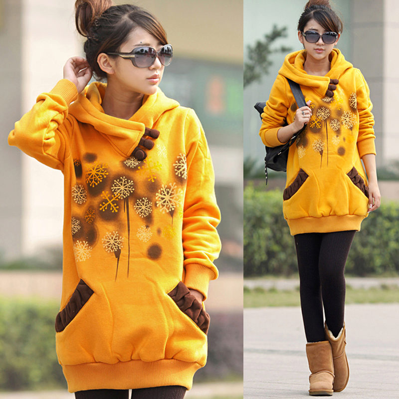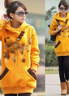 - Dress hoodie-length above the knee, with a spectacular elastic band at the hem and a bright print combined with thick leggings. Uggs will complement the image.