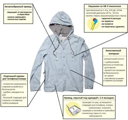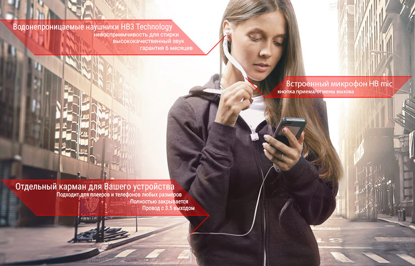Hood on the drawstring with a built-in zigzag elastic wire headphone with 3.5mm jack. It is protected from bends and stretch marks. And it can still be used to adjust the depth of the hood, that is, if desired, tie. Headphones, made by HB3 technology, are not the most powerful, but they are enough to comfortably listen to music and at the same time do the exercises. Their frequency range is from 20 Hz to 20 kHz, and on some models there is a built-in HB mic microphone with which you can answer a call.