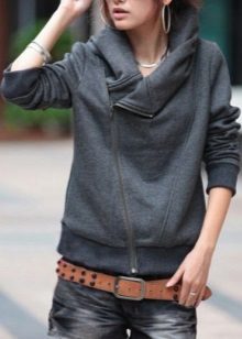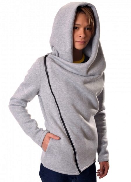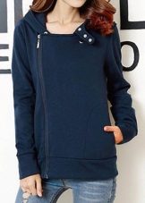 - WITH slanting lightningThis is an interesting model that differs from the usual understanding of a zipper sweatshirt. Everyone is accustomed to, that the snake passes strictly in the middle of the product. But designers, as always, want to surprise the consumer and sew oblique zippers. This adds originality and ease to the product.
