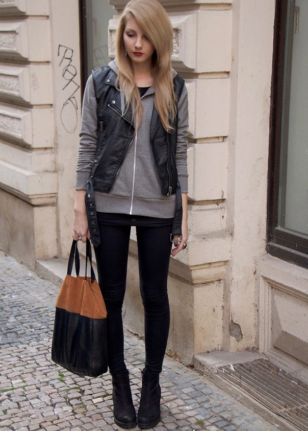Tight-fitting pants go well with a bulky sweatshirt. It helps to balance the bottom and top.