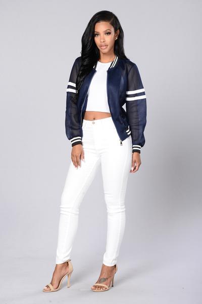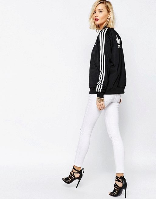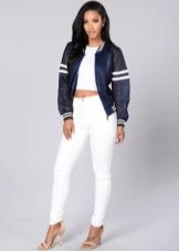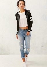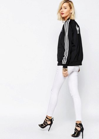 - White crop-top in combination with white skinny and black olympic shirt looks spectacular. Complement the image of heels sandals and massive earrings. So you can go to a fashionable party. And if you replace sandals with sneakers, you will get a stylish look for every day.