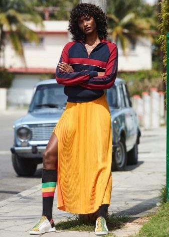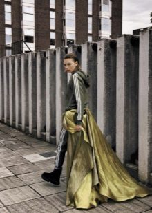 - Another unusual look for a special occasion. Olimpiyka, skirt in multi-colored sequins and sneakers. Add to this image stylish accessories and you will look fashionable and unusual.