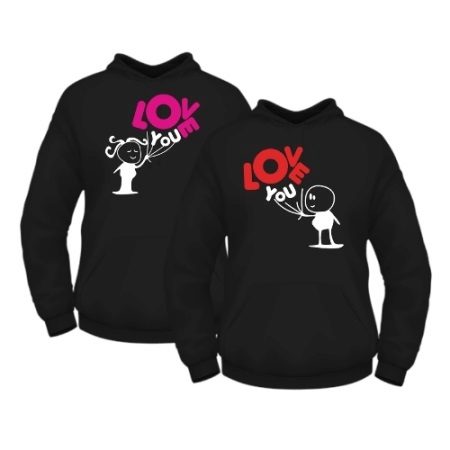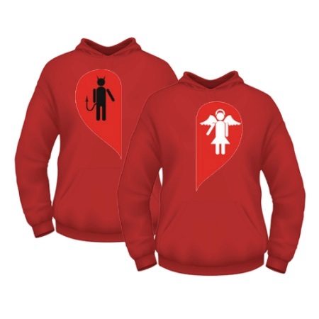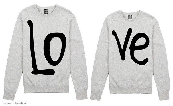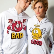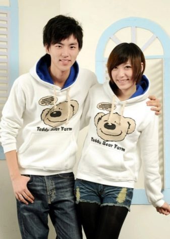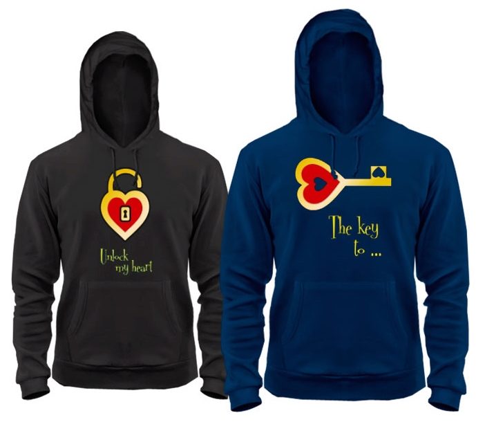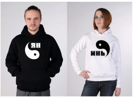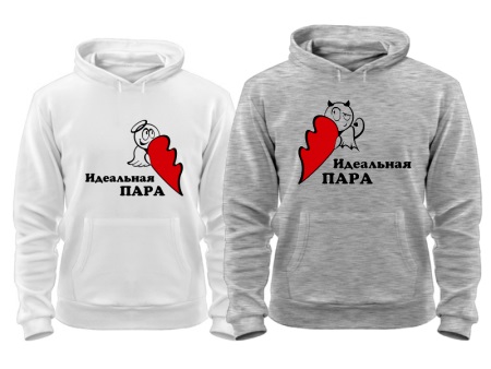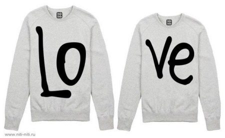 In such models, very often drawing on one product completes or complements drawing on another. Often you can find sweatshirts for lovers with inscriptions expressing the nature of the relationship in a pair. Usually, these are humorous statements emphasizing the youth and ambition of young people.