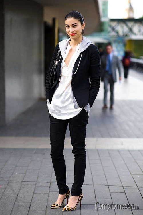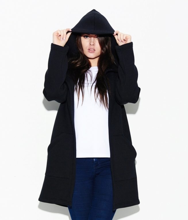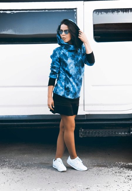 Hoodies can also be worn under outerwear. They are perfectly combined with a coat or jacket. This image is multi-layered. Elongated models can be combined with the bottom of the fitting cut - leggings, skinny or juggins.